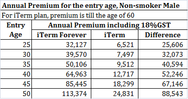 For premium comparison, I picked up annual premiums for iTermForever plan and iTerm plan. The premiums are for a non-smoker male residing in Mumbai. For iTerm plan, the annual premium is for a plan with tenure ending at the age of 60 years. The premium is for a life cover of Rs 1 crore.